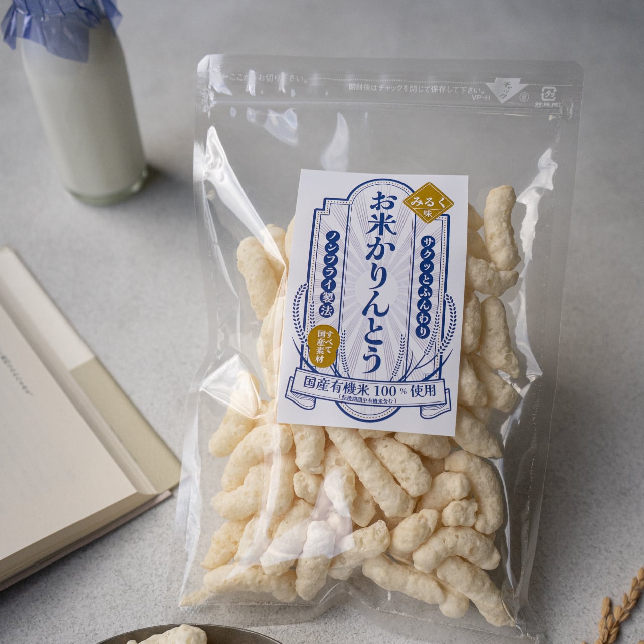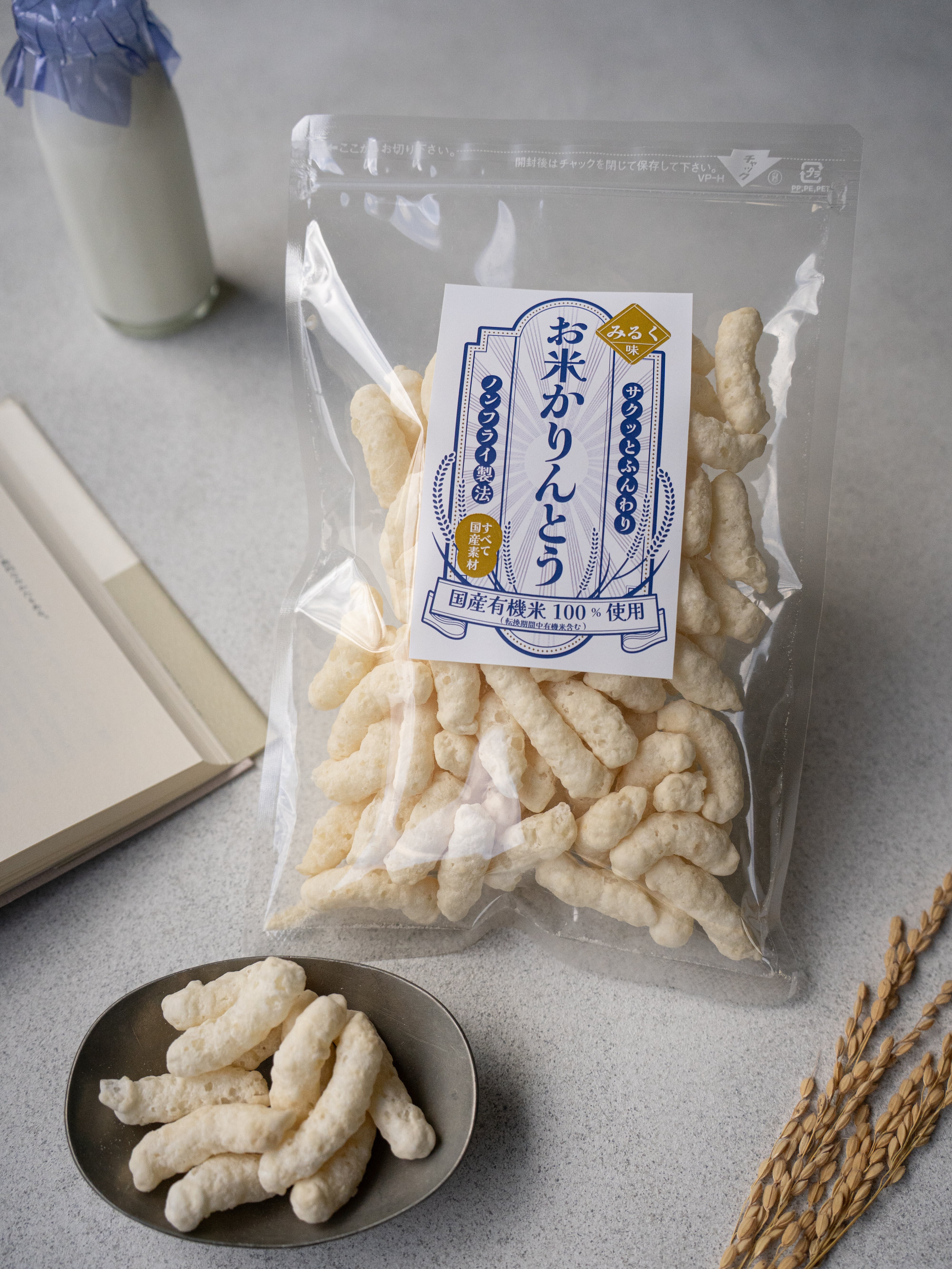 100%有機栽培の国産米をパフ化し、北海道産の生乳から作られた牛乳とバターでコーティングした「みるく味」。コク深くやさしい甘みが口いっぱいに広がり、サクサクと軽やかな食感とともに贅沢なミルクの風味をお楽しみいただけます。お茶うけにはもちろん、コーヒーや紅茶とも相性抜群。小さなお子様から大人まで幅広くお召し上がりいただける、グルテンフリーのお米かりんとうです。