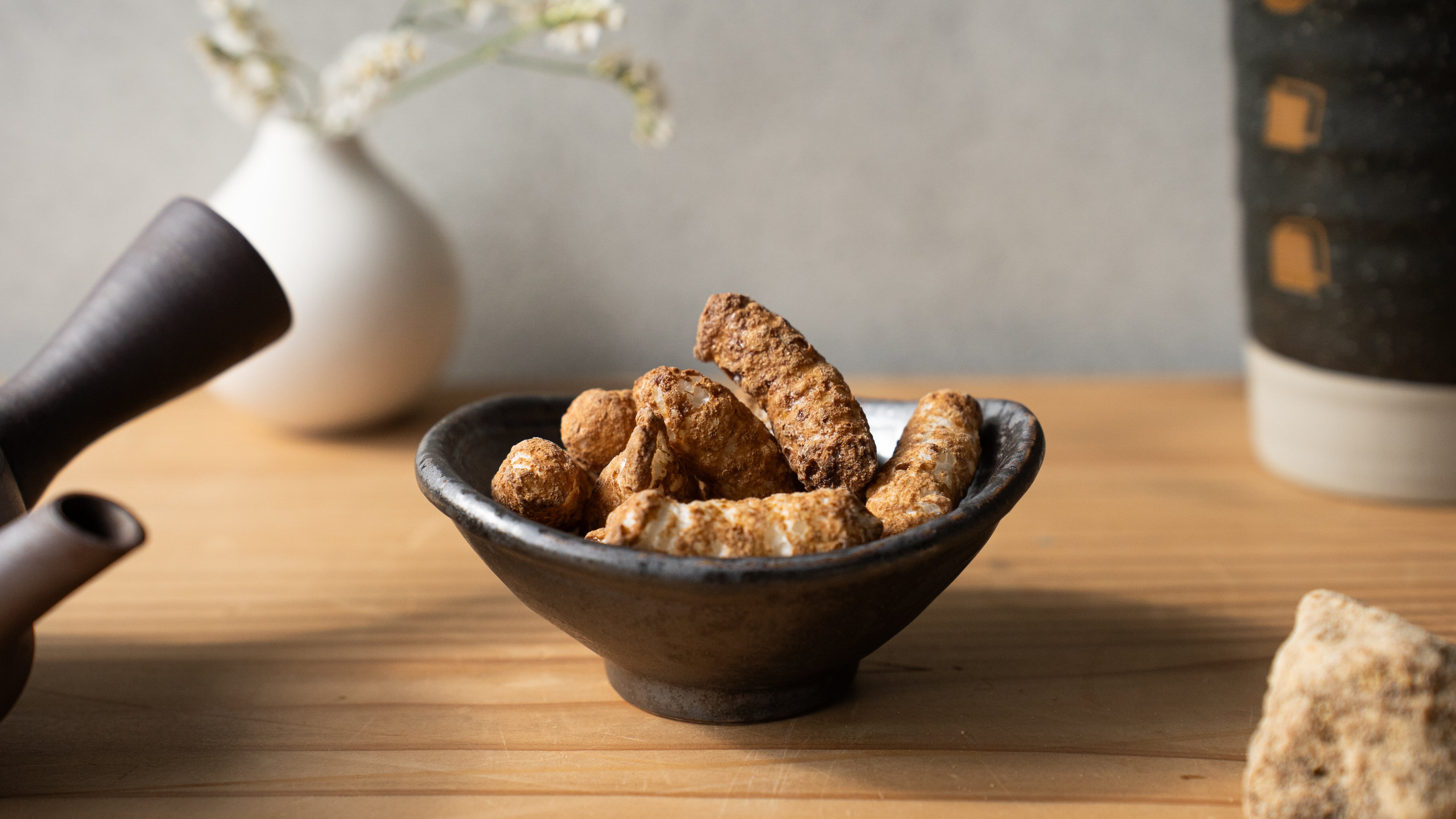 和歌山県産うるち米の米パフに沖縄県産黒糖を贅沢にコーティングした「黒糖味」。原材料はお米と黒糖のたった2つだけ。ノンフライ製法で油分ゼロのサクサクとした軽やかな食感を実現しました。かりんとう特有の固さがなく、小さなお子様からご高齢の方まで安心してお召し上がりいただけます。黒糖の深いコクとやさしい甘みを、グルテンフリーでヘルシーにお楽しみください。