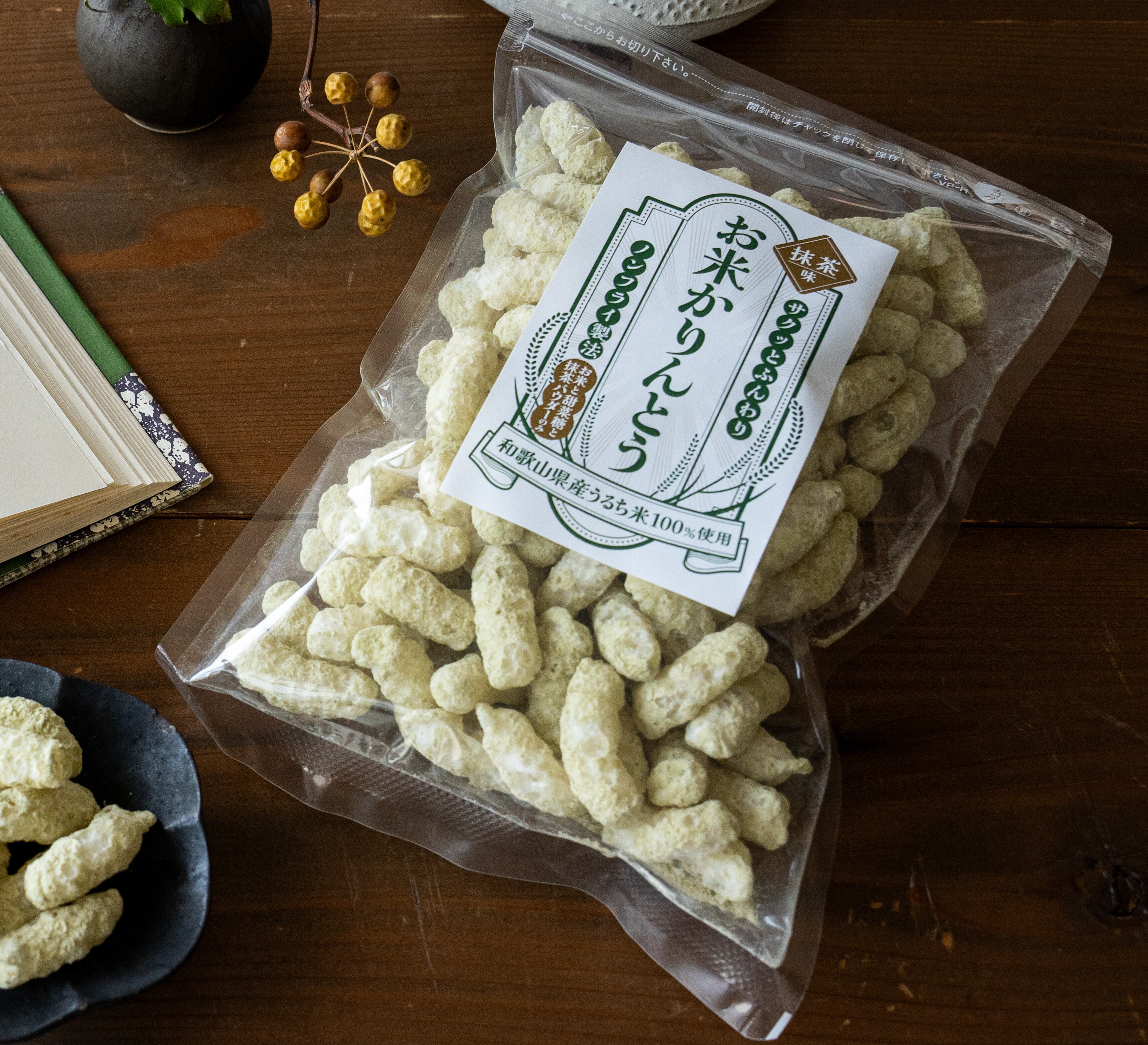 和歌山県産うるち米の米パフに北海道産甜菜糖のやさしい甘さと、京都・宇治産抹茶粉末を贅沢にコーティング。サクサク軽やかな食感とともに、ほろ苦く香り高い宇治抹茶の風味を楽しめるグルテンフリーのお米かりんとうです。小麦粉を使わずうるち米で仕上げているため、グルテンを気にされる方にも安心。上質な素材と伝統の味わいを組み合わせた、贅沢な米菓子をお楽しみください。